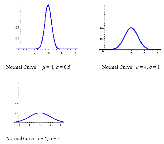 In the following 3 distributions, we have the same mean (μ = 4), but the standard deviation becomes bigger, meaning the spread of scores is greater.
